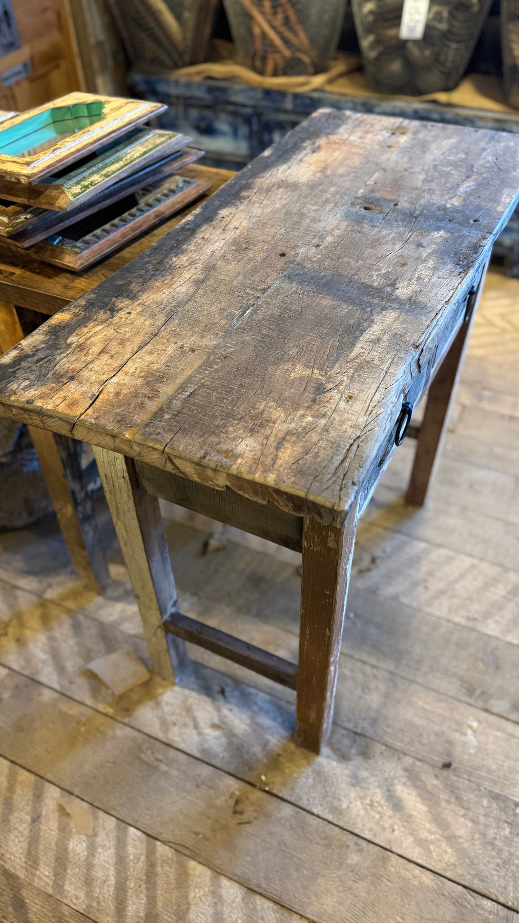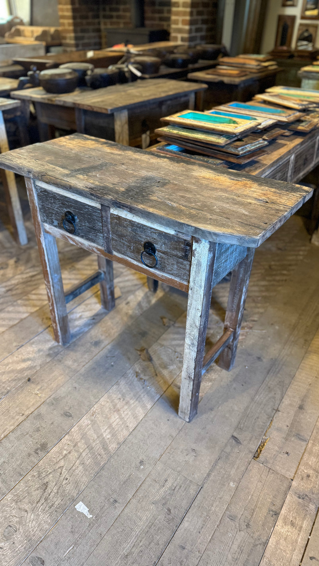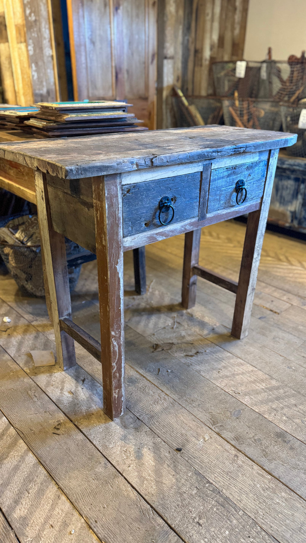 Lovely trestle table has two drawers and made with reclaimed characterful wood. The two drawer are large and perfect for storage and have two heavy ring pull handles.