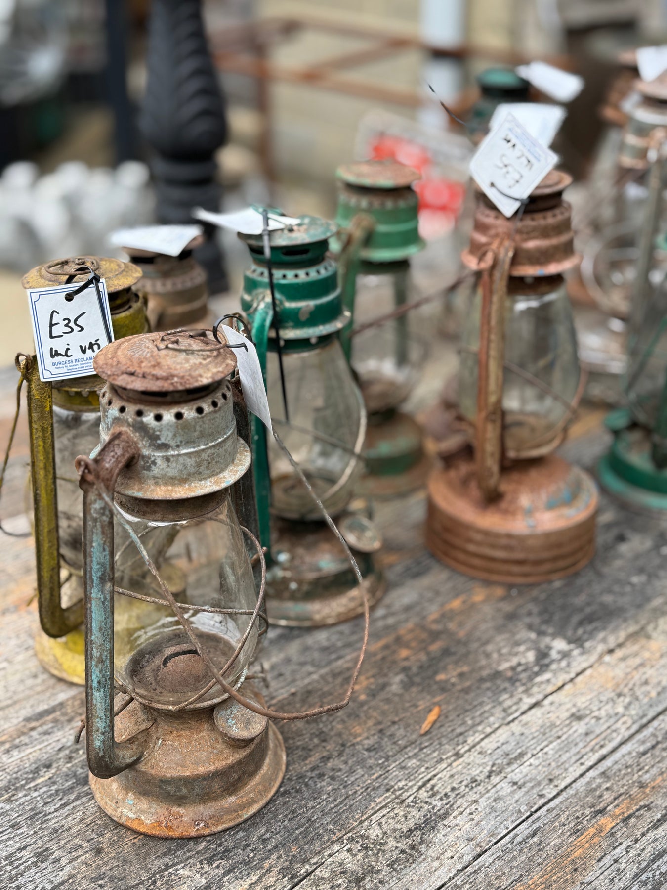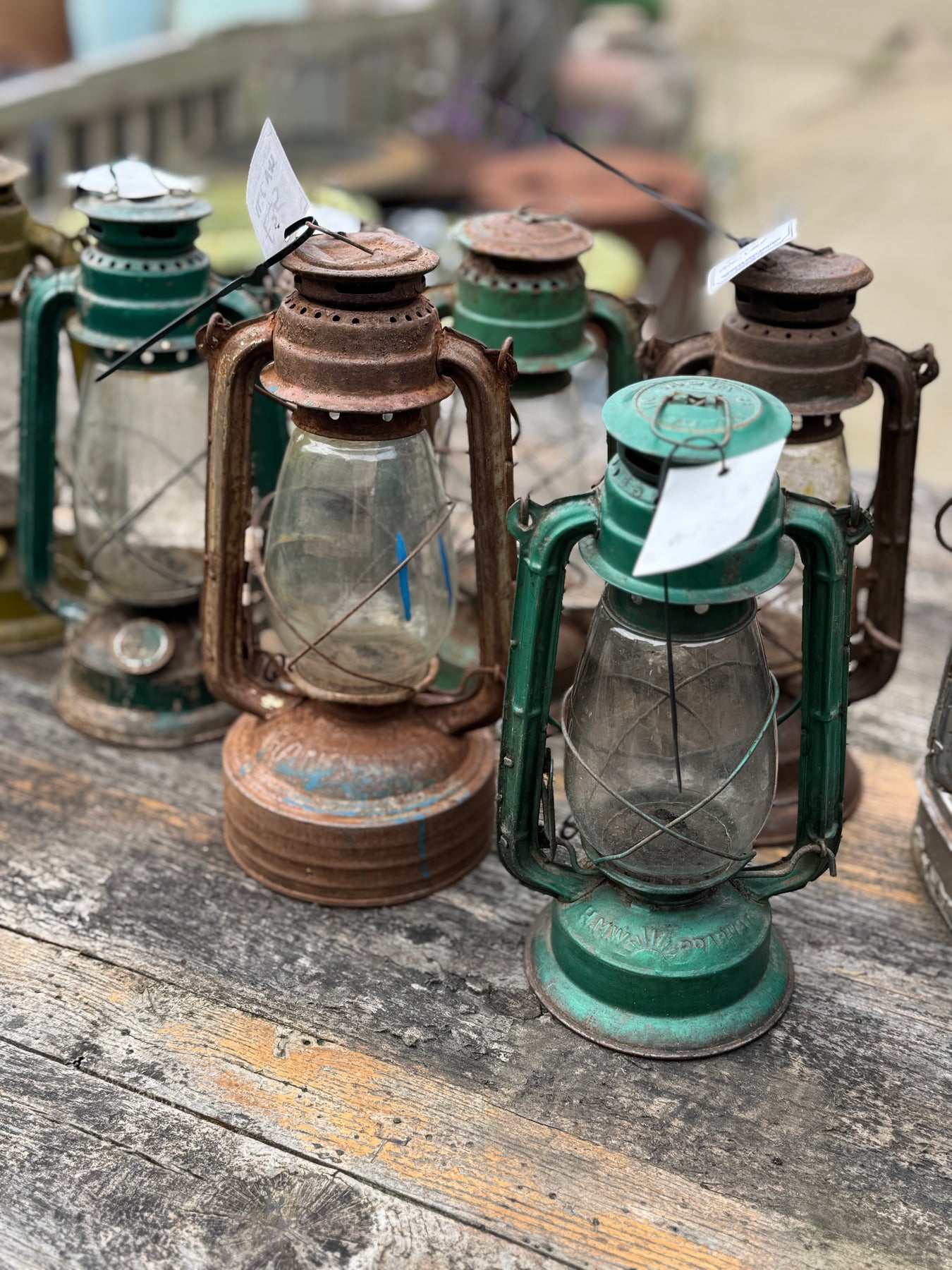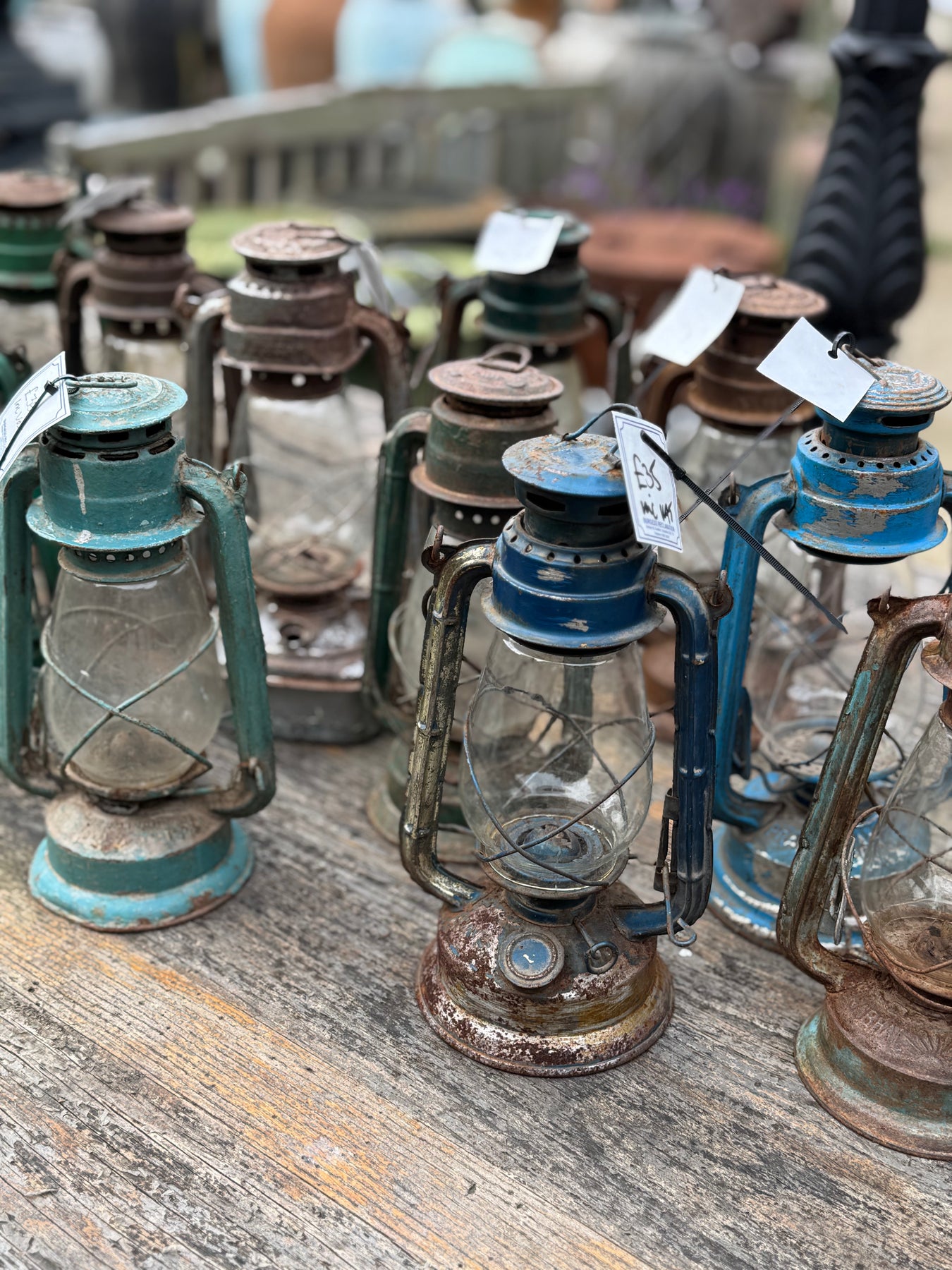 Regular price £35.00 Save Liquid error (snippets/product-template line 157): Computation results in '-Infinity'%A collection of vintage oil lamps in muted, timeworn colours — from rustic rusty tones to aged yellow, green, and blue. Each lamp carries a unique patina and character, making them perfect as decorative accents or nostalgic statement pieces. Approx. 30 cm high × 15 cm wide.
